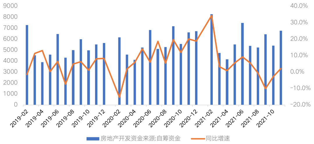 房地產開發企業到位資金(自籌資金)數據顯示,2021年11月單月值為6761億元,單月資金量年內僅次于6月,從增速來看,同比增長2.1%,增速自8月后首次重新回正。