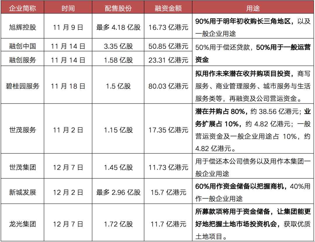 除此之外,旭輝和新城發展以股東托底的供股方式進行,11月9日旭輝控股配售最多4.18億股,募集金額約16.73億港元,其中90%用于明年初收購長三角地區,以及一般企業用途;12月2日新城發展配售最多2.96億股,募集金額約15.7億港元,其中60%用作資金儲備以把握商機,40%用作一般企業用途。