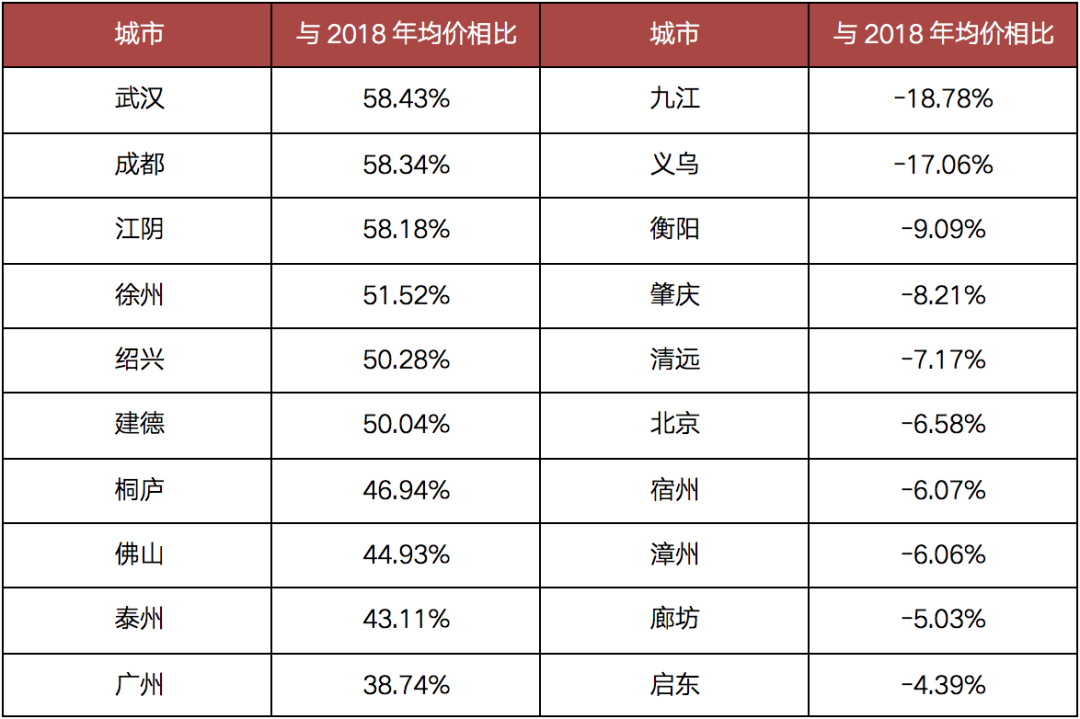 表:重點城市中與2018年均價相比
