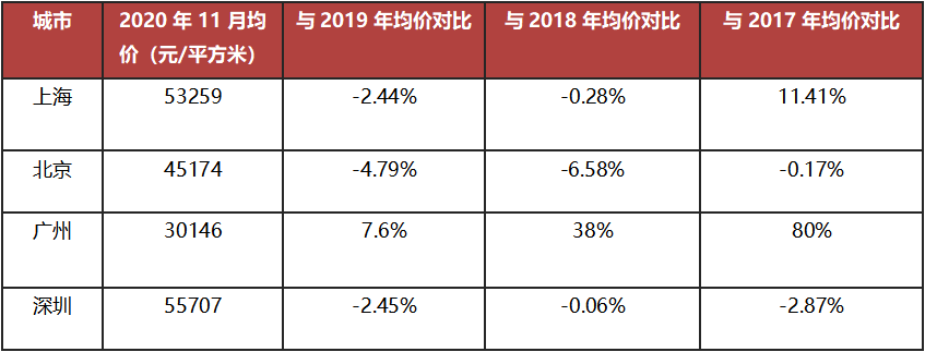 從均價來看,2020年11月一線城市中,北京、上海、深圳成交均價都呈現不同程度下滑,其中,北京跌幅最大較2019年全年成交均價下滑4.79%,其次是深圳,下滑2.45%。四大一線城市中,唯有廣州11月均價較2019年均價出現上漲,漲幅約7.6%。