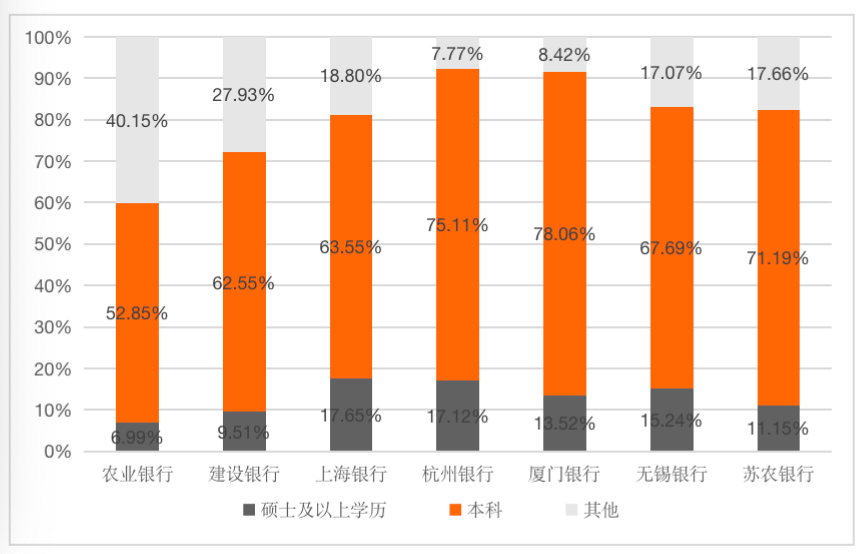 但從技術人員占比(廈門銀行、蘇農銀行數據未披露)和員工學歷來看,國有商業銀行并不占優勢。商業銀行技術人員占比最高的是杭州銀行,占比為12.45%;農業銀行和建設銀行的技術人員占比分別為7.58%、8.12%;上海銀行的技術人員占比最低,為6.30%。商業銀行碩士及以上學歷的員工占比最高的是上海銀行,占比為17.65%;商業銀行本科及以上學歷的員工占比最高的是杭州銀行,占比為92.23%;而碩士及以上學歷的員工占比最低和本科及以上學歷的員工占比最低的是農業銀行,占比分別為6.99%、59.85%。