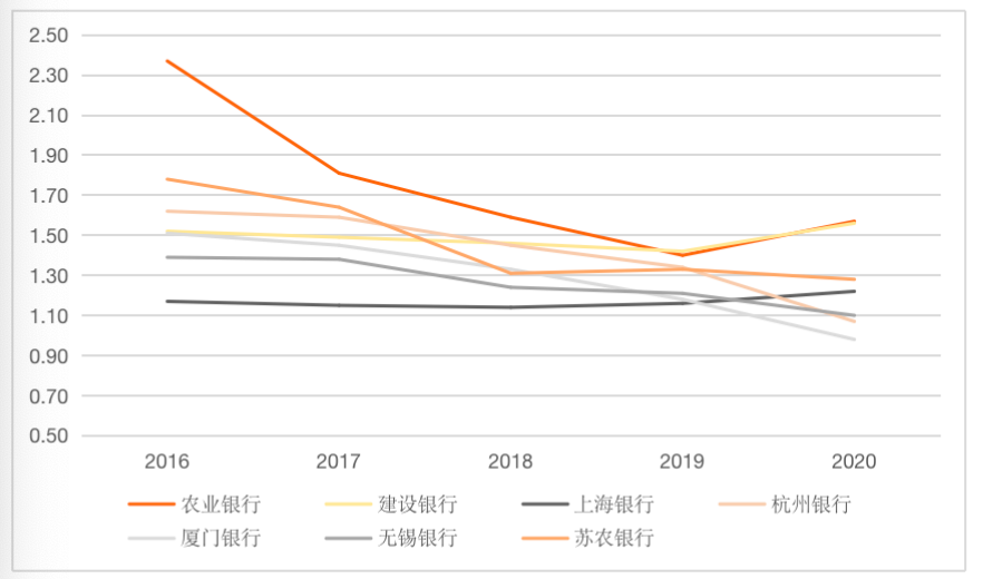 商業銀行的不良貸款率體現了銀行的貸款質量,也在一定程度上能夠體現銀行搜尋優質客戶的能力。上海銀行的不良貸款率近5年穩定在1.10%~1.25%之間,2020年其不良貸款率為1.22%。農業銀行和建設銀行在2020年的不良貸款率相差不大,分別為1.57%、1.56%。杭州銀行、廈門銀行、無錫銀行和蘇農銀行的不良貸款率近幾年呈現出不斷下降的趨勢。2020年,廈門銀行的不良短款率最低,為0.98%。