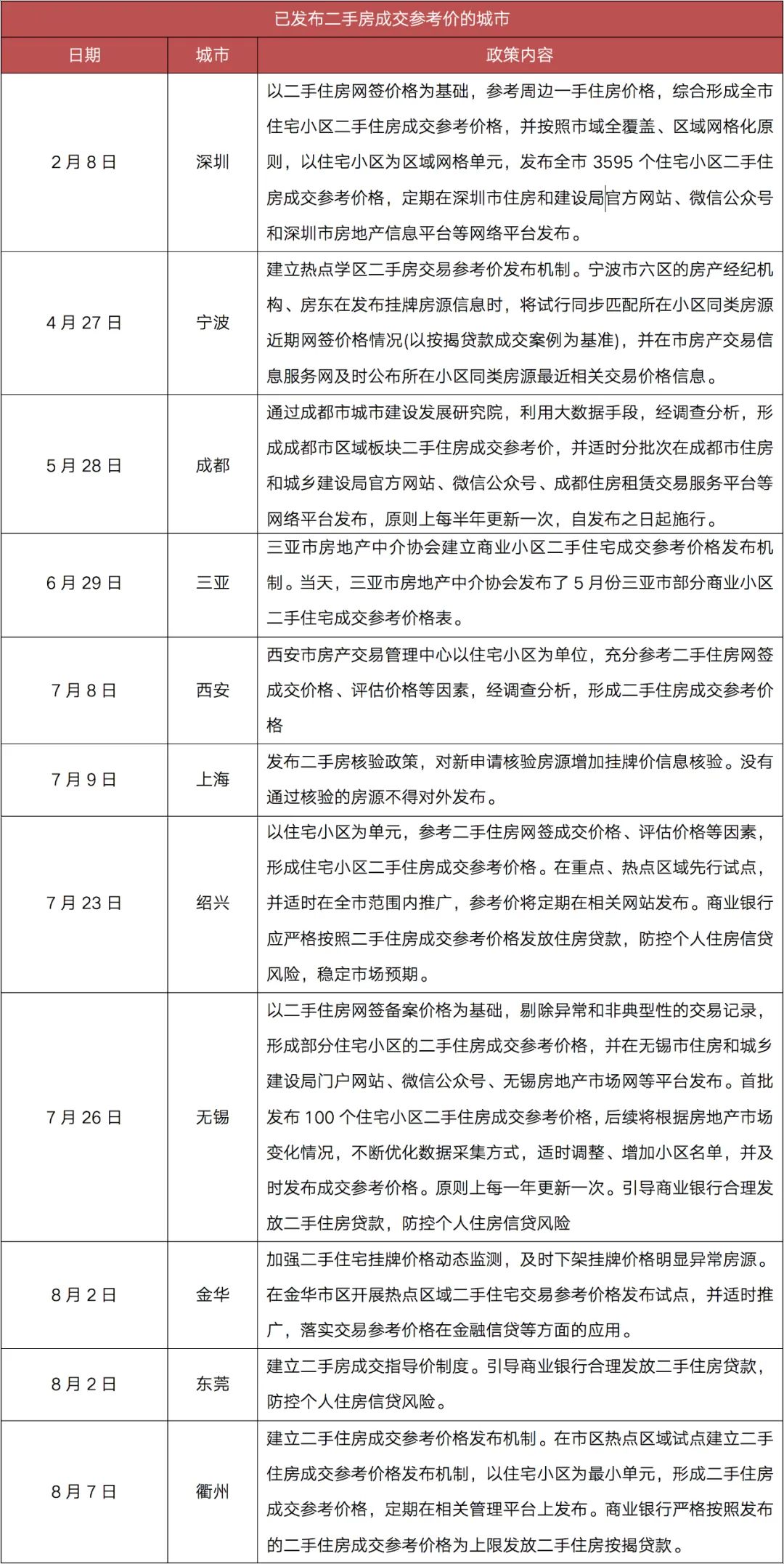 表:已發(fā)布二手房成交參考價的城市