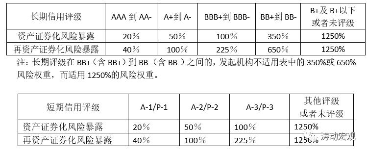 (1)2012年6月7日,銀監會發布《商業銀行資本管理辦法(試行)》,明確商業銀行擁有的債務工具擁有合格外部評級機構提供的債項評級結果的,則該債務工具的風險權重將根據其外部評級來確定。以商業銀行持有的資產證券化產品為例,相應的外部評級與對應的風險權重如下: