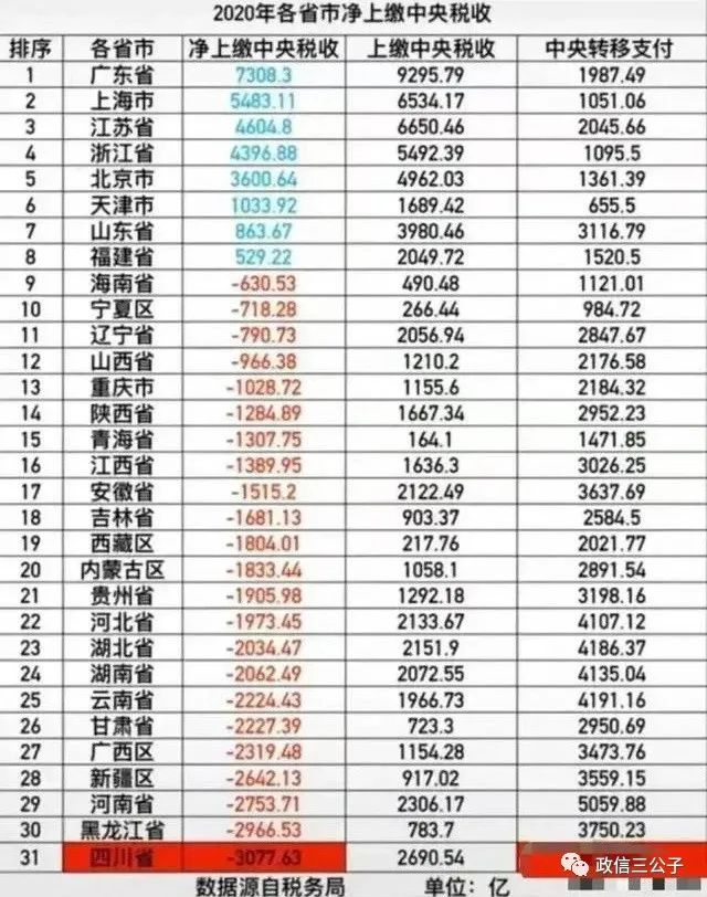 而在整個2020年度,各省市凈上繳中央稅收,排名最后的依次是: