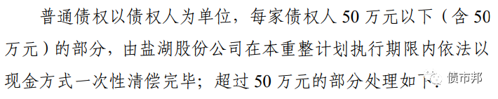 這其實是對散戶投資人剛兌的意思,中國債券市場延續了銀行存款保險制度里面對50w元存款全額保障的思路,目前披露的破產重整方案都延續了50w債權剛兌的做法。這也是散戶參與高收益債市場最大的優勢,中國債券市場除了城投信仰,還有散戶信仰。