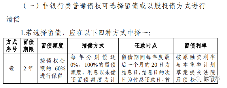 鹽湖的非銀機構債權人,既可以選擇債轉股,也可以選擇留債現金清償,其中現金清償可以選擇5年拿回100元的本金,4年拿回80%的本金,3年拿回68%的本金或是2年拿回60元的本金,機構可以根據自己的持倉成本和負債穩定性自主選擇現金償債方案。