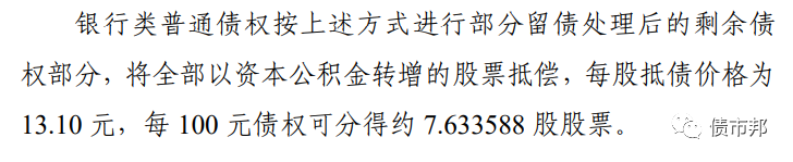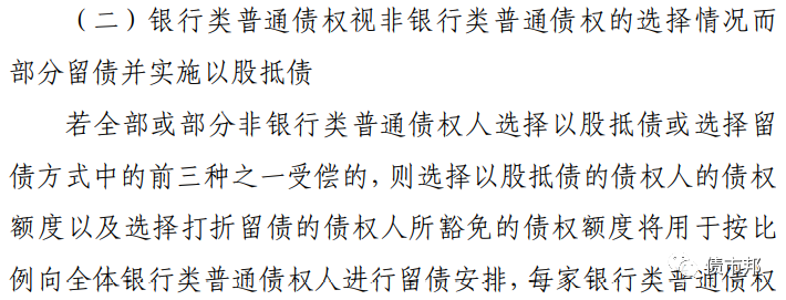 根據破產重整方案,商業銀行只能獲得非銀機構放棄的債權的現金清償權利,也就是前文所述的11.8億元,對于商業銀行持有的幾百億債券而言是杯水車薪。所以絕大多數商業銀行債權都只能被迫債轉股。