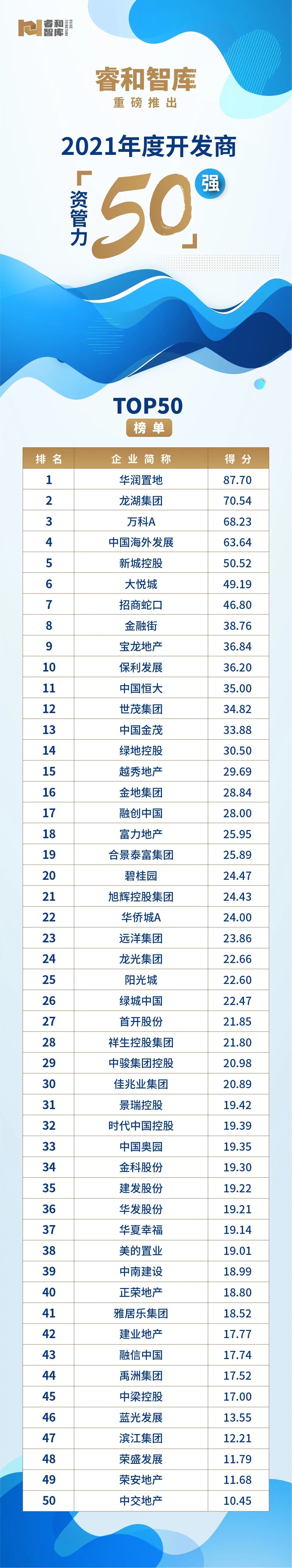 睿和智庫研究部長期跟蹤開發(fā)商資管力經(jīng)營表現(xiàn),特推出“2021年開發(fā)商資管力50強”。