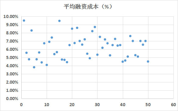 TOP50開發(fā)商2020年平均融資成本介于3.8%~9.49%之間。其中,融資成本最低的是中國海外發(fā)展,融資成本3.8%,最高的是中國恒大,融資成本9.49%。融資成本超過7%的開發(fā)商17家,占比34%;融資成本介于5%~7%的開發(fā)商21家,占比42%;融資成本低于4%的開發(fā)商僅1家。