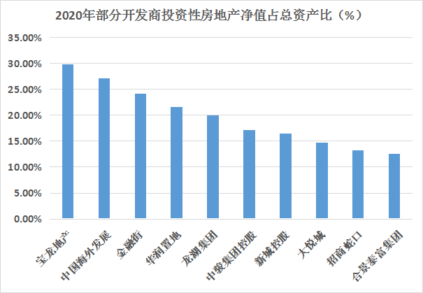 TOP50開發(fā)商2020年投資性房地產(chǎn)凈值占總資產(chǎn)比分化明顯。其中,投資性房地產(chǎn)凈值占總資產(chǎn)比前三位分別為寶龍地產(chǎn)29.85%、中國海外發(fā)展27.11%、金融街24.13%。占比超過20%的開發(fā)商有4家,占比超過10%的13家。