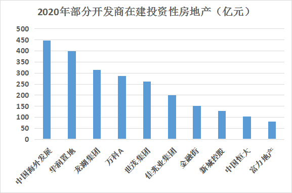 TOP50開發(fā)商2020年在建投資性房地產(chǎn)規(guī)模合計約為3138億元。其中,在建規(guī)模前三位分別為中國海外發(fā)展447.79億元、華潤置地398.26億元、龍湖集團313.96億元,在建規(guī)模在100億級別以上的開發(fā)商有9家。