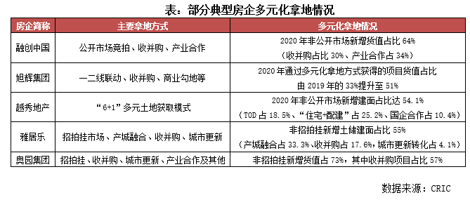 例如旭輝,2020年通過一二線聯(lián)動(dòng)、收并購、商業(yè)勾地等多元化拿地方式獲得的項(xiàng)目貨值占比由2019年的33%提升至51%。此外,越秀也不斷完善、豐富“6+1”的多元土地獲取模式,包括TOD、城市更新、“住宅+配建”、國(guó)企合作、收并購、產(chǎn)業(yè)勾地和公開市場(chǎng)競(jìng)拍,在2020年新增投資中通過非公開市場(chǎng)獲取的地塊占比達(dá)到54.1%,TOD、“住宅+配建”、國(guó)企合作增儲(chǔ)模式分別占新增土儲(chǔ)的18.5%、25.2%和10.4%。