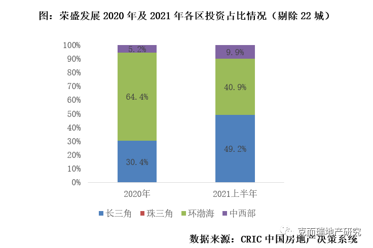 榮盛、金科調(diào)整區(qū)域布局,避開長三角、珠三角熱門城市,尋求三四線城市投資契機。榮盛起家于河北,金科起家于重慶,從二者近年來的布局來看,企業(yè)正積極調(diào)整投資布局,弱化大本營投資,向長三角、珠三角等熱點區(qū)域進軍。然而由于土地市場持續(xù)高熱,競爭壓力較大,作為新晉房企,榮盛和金科選擇避開熱點的22城,尋求其他三四線城市布局契機。根據(jù)CRIC監(jiān)測,2021年上半年榮盛發(fā)展非22城拿地金額占比達61.3%,明顯高于TOP50房企平均水平的36.6%。