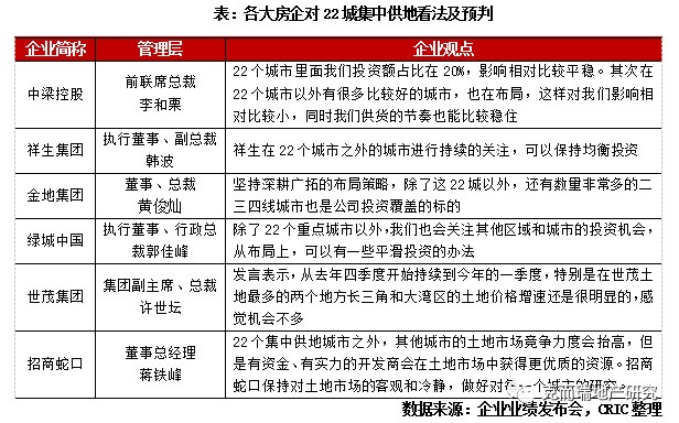 中梁、祥生、金地、綠城表示要尋求22城之外投資機會,招商蛇口、世茂直言部分熱點區(qū)域土地價格被抬高。在房企的年終業(yè)績發(fā)布會上,“雙集中”供地后的土地投資策略是被提及最多的問題之一,謹慎、中性、保持節(jié)奏是多數(shù)房企的回答。其中中梁、祥生、金地、綠城等房企提出除了關注22城集中供地之外,還要尋求其他城市的投資機會來平衡投資。而世茂管理層則直言長三角和大灣區(qū)土地價格增速明顯,感覺機會不多。招商蛇口也表示其他城市土地競爭力抬高,要保持客觀冷靜的投資態(tài)勢。