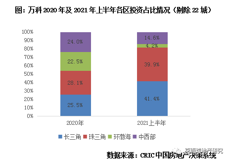 基于長三角、珠三角的發(fā)展前景,萬科下沉兩地非22城尋求投資契機。根據(jù)CRIC監(jiān)測,在保持了一定投資力度的前提之下,上半年萬科投資力度向非22城傾斜,占比相比2020年上升了9.3個百分點達到了62.0%,上半年并未在一線城市納儲。并且萬科則出現(xiàn)了非常典型的區(qū)域集中情況,2021年上半年,萬科非22城投資金額中超過8成投向了長三角、珠三角兩大區(qū)域,以金華、溫州、中山等熱點城市為主,相比2020年的均衡型投資有明顯調(diào)整。不過在6月底,萬科進行了新的組織架構變革,由五大區(qū)裂變成七大區(qū),主要是將北方區(qū)域裂變?yōu)楸本|北,中西部裂變成華中、西南區(qū)域,組織先行,未來企業(yè)仍有望擴大兩地拿地份額。