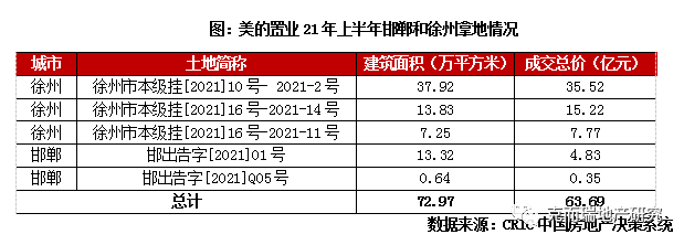 美的置業(yè)持續(xù)鞏固深耕優(yōu)勢城市,上半年僅在22城斬獲一幅土地。美的置業(yè)同樣采取深耕策略,不過與中梁、祥生不同的是,美的置業(yè)持續(xù)加碼自身的高市占率城市。企業(yè)2010年走出珠三角,其全國化布局便是從長三角的徐州開始,之后進駐邯鄲,根據(jù)CRIC的統(tǒng)計,2020年美的置業(yè)在兩城的市占率均居首位。2021年上半年,美的置業(yè)持續(xù)擴大在徐州和邯鄲的布局,分別拿下3幅、2幅土地,合計拿地金額達63.69億元。