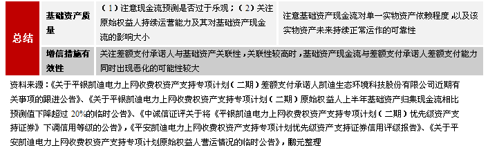 近期熱議的合肥中院對凱迪電力一期ABS基礎資產與原始權益人獨立性的司法判定是我國證券化市場上首個司法機構對基礎資產與原始權益人獨立性的判定案例,為我國收費收益權類基礎資產實現與原始權益人的破產隔離提供了重要的參考。關于這個案例的經過可參考相關研究報告[16],本文不再贅述。對于這個案例,我們這里從信用風險的角度進行分析。(a)此次判定結果從兩個層面上認定了基礎資產與原始權益人的獨立性:首先,認定基礎資產為真實銷售,確定了基礎資產與原始權益人間的獨立關系,保護基礎資產現金流不受原始權益人其他債權人影響;其次,從資產服務機構角度,“合肥科農行大興支行曾經抗辯稱,《基礎資產買賣協議》明確約定在監管銀行將電費收入劃入專項計劃賬戶后,該筆款項的所有權才歸專項計劃所有,劃轉之前仍屬南陵凱迪公司所有,現相關款項并未到賬,故相關電費收入尚不屬于平安凱迪專項計劃享有。合肥中院對此作出明確區分,不能以資金歸屬界定電力上網收費權的歸屬”,我們認為合肥中院的這一認定,確認了基礎資產與資產服務機構間的獨立性。(b)凱迪電力一期ABS交易結構的設置在能夠一定程度上減輕專項計劃投資者損失:首先,根據《專項計劃說明書》,“原始權益人將基礎資產質押給專項計劃,并在人民銀行征信中心辦理與基礎資產質押有關的登記公示”,雖然基礎資產質押可能導致基礎資產被判定為非真實出售,但其能防止原始權益人將基礎資產用于其他目的二次質押;其次,根據《專項計劃說明書》,專項計劃設置了權利完善事件,當資產服務機構、原始權益人或差額支付承諾人及監管賬戶出現異常時,通知電力公司將基礎資產對應電費收入直接轉付至專項計劃賬戶或其他指定賬戶,這一措施能在一定程度上緩釋基礎資產現金流受相關主體信用質量惡化的不利影響;最后,原始權益人所擁有的機器設備、土地房產及原始權益人股權質押給管理人,這個措施一方面能防止原始權益人及相關機器設備受其他債權人不利影響進而導致基礎資產無法正常產生現金流,另一方面當基礎資產無法正常產生現金流時,專項計劃投資者相對于其他債權人來說擁有對機器設備、土地房產及原始權益人股權的處置優先權。(c)專項計劃管理人盡職的重要性:本案例中管理人的盡職能力的重要性體現在其代表投資者維護基礎資產不受原始權益人其他債權人影響方面。