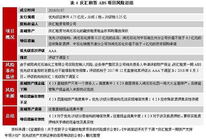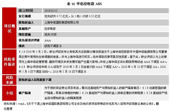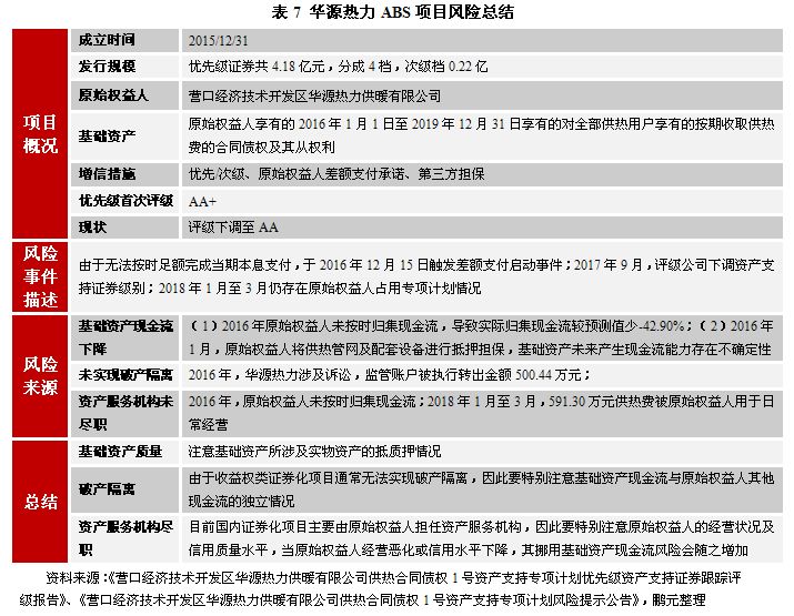 值得注意的是,在對基礎資產質量關注方面,我們還需關注基礎資產及基礎資產所涉及的實物資產是否存在權利瑕疵。例如,華源熱力ABS項目中,原始權益人在2016年1月將供熱管網及配套設備進行抵押擔保,導致基礎資產未來產生現金流能力存在不確定性。