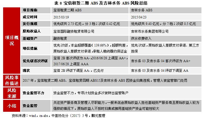 資產服務機構、管理人等其他主要參與主體是否盡職盡責,是決定基礎資產現金流能否順利實現由基礎資產流轉至投資人手中的關鍵因素。在華源熱力ABS項目中,作為資產服務機構的原始權益人在2016年未及時將基礎資產現金流歸集從而導致基礎資產現金流較預期大幅下降,此外原始權益人未將2018年1-3月[17]收取的基礎資產現金流歸集至監管賬戶而用于其日常經營。在寶信租賃二期資產支持專項計劃(以下簡稱“寶信租賃二期ABS”)及吉林水務供水收費權資產(以下簡稱“吉林水務ABS”)支持專項計劃兩個項目中,計劃管理人對資金監管不力導致專項計劃資金多次被轉出監管賬戶為原始權益人再使用。在上述三個項目中,一方面資產服務機構及管理人未嚴格對基礎資產現金流進行歸集及監管,可能導致相應的資產支持證券無法按時償付風險;另一方面,三個項目中的基礎資產現金流都出現被原始權益人挪用的情況,這進一步加重了基礎資產現金流對原始權益人主體信用水平的依賴程度,違背了用資產信用代替主體信用的原則。