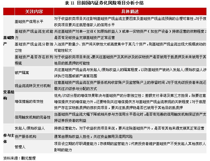 遵循資產證券化項目風險分析的一般思路,即對資產證券化的核心風險分析主要從基礎資產風險分析、交易結構分析及相關參與主體分析三個部分入手,我們對上述所分析的目前國內證券化風險項目的總結可歸納如11所示。