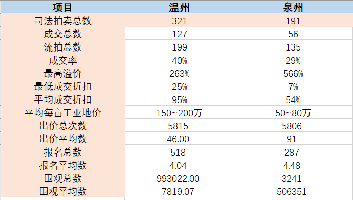 2017年淘寶數據中工業資產已結束的司法上拍記錄中泉州191個,溫州321個,剔除流拍/撤回/中止等因素抽取成交數據做參考。如上表所示:泉州整體上拍賣總量比溫州低41%,成交折扣低41%,成交率低11%,溫州平均每畝工業用地均價高出泉州近一倍。不論是工業成交價,平均溢價率,競爭程度,平均工業用地價格等方面兩地相距甚遠,筆者特意收集了報名人數/出價次數/圍觀人數這3組數據,發現幾乎溫州溢價在120%以上的工業拍品都會有至少3人以上哄搶的場景,完全可以用“網紅”來形容溫州的工業二級市場。