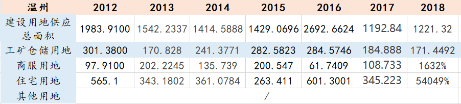 表4(2012年-2018年溫州建設用地一級市場供應數據明細)數據來源:溫州市國土資源局/中國自然資源部/溫州市統計局(單位:公頃)