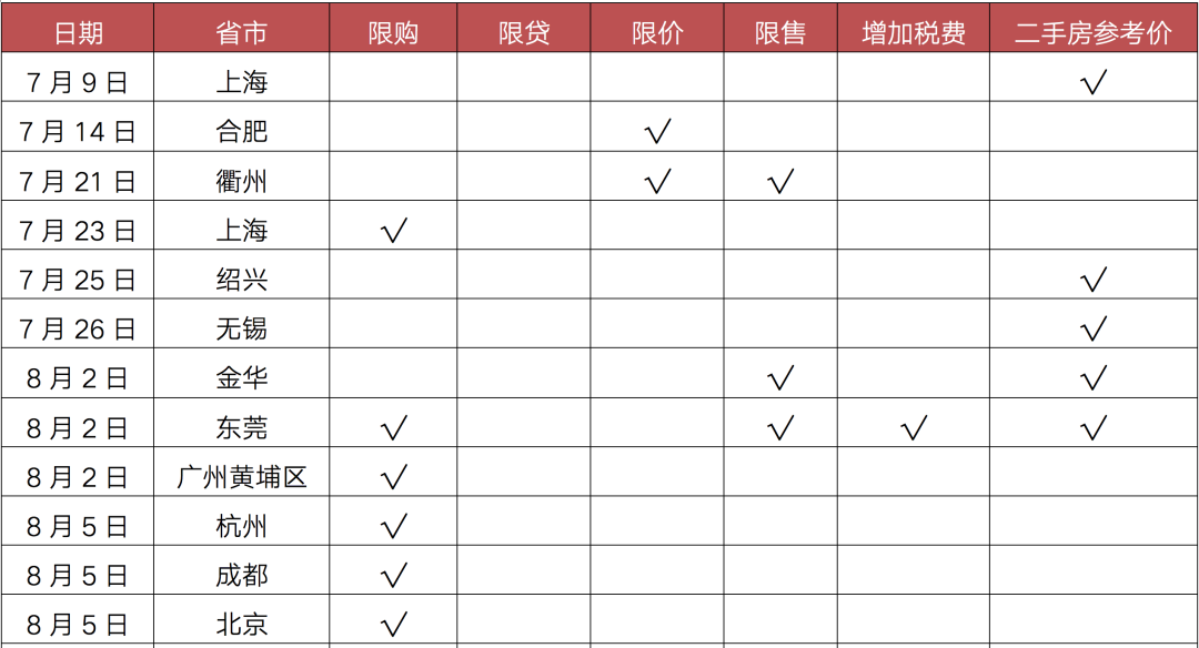 值得注意的是,上海、廣州、東莞等9城建立二手房參考價發布機制,引導二手房理性交易,維穩房價預期。其中,上海政策力度最為嚴苛,將以市場真實價格為依據,對每套房源進行核驗,沒有通過價格核驗的房源不得對外發布。