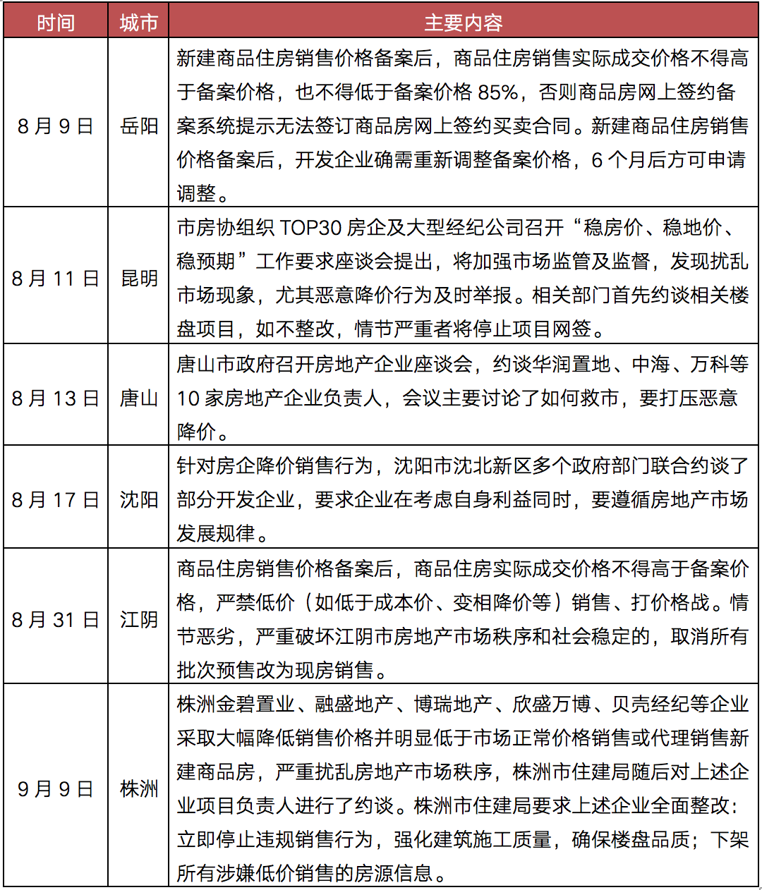出于穩房價、穩預期的需要,岳陽、昆明等6城相繼落地“限跌令”。其中,岳陽、江陰明文規定禁止大幅降價,昆明、唐山、沈陽、株洲采取約談的方式,禁止房企、中介機構惡意降價、打價格戰,擾亂房地產市場秩序。