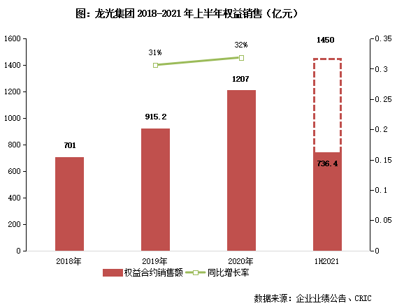 2021年上半年,龍光連續(xù)6個(gè)月業(yè)績(jī)均破百億,累計(jì)實(shí)現(xiàn)權(quán)益銷(xiāo)售額736.4億元、權(quán)益銷(xiāo)售面積390.5萬(wàn)平方米,分別同比增長(zhǎng)58.9%、28.3%。按全年1450億元銷(xiāo)售目標(biāo)算,上半年目標(biāo)完成率達(dá)到50.8%。從供貨安排來(lái)看,下半年可售貨值有1560億元,新開(kāi)盤(pán)項(xiàng)目有33個(gè),繼續(xù)保持銷(xiāo)售節(jié)奏,大概率會(huì)達(dá)成年度目標(biāo)。