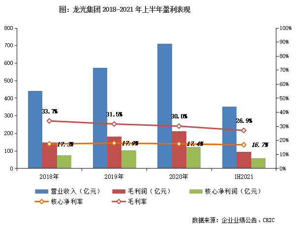 【利潤(rùn)率保持行業(yè)競(jìng)爭(zhēng)力,同時(shí)也面臨下行壓力】報(bào)告期內(nèi)實(shí)現(xiàn)營(yíng)收351.7億元,同比增長(zhǎng)約13.3%。毛利潤(rùn)較2020年同期有所減少,為94.7億元。隨著行業(yè)利潤(rùn)率整體下滑,公司毛利率為26.9%,較2020年降低3個(gè)百分點(diǎn)。凈利潤(rùn)、核心凈利潤(rùn)維持增長(zhǎng),分別為65.0億元、58.6億元,凈利率為18.5%,核心凈利率為16.7%。整體來(lái)說(shuō),龍光利潤(rùn)率仍保持在行業(yè)較高水平,未來(lái)保證、提升自身的盈利能力,需進(jìn)一步加強(qiáng)土地成本控制、提高管理效能。