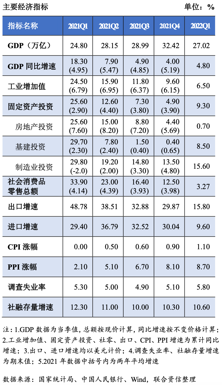 2022年一季度,我國經(jīng)濟發(fā)展面臨的國內(nèi)外環(huán)境復(fù)雜性不確定性加劇、有的超出預(yù)期。全球經(jīng)濟復(fù)蘇放緩,俄烏地緣政治沖突導(dǎo)致全球糧食、能源等大宗商品市場大幅波動,國內(nèi)多地疫情大規(guī)模復(fù)發(fā),市場主體困難明顯增加,經(jīng)濟新的下行壓力進一步加大。在此背景下,“穩(wěn)增長、穩(wěn)預(yù)期”成為宏觀政策的焦點,政策發(fā)力適當(dāng)靠前,政策合力不斷增強,政策效應(yīng)逐漸顯現(xiàn)。
