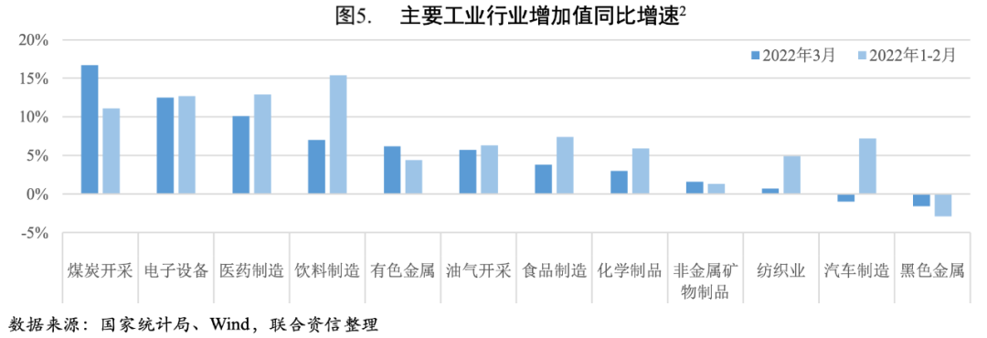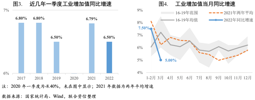 3月工業(yè)生產(chǎn)低迷拖累一季度整體增速。2022年一季度,在一系列工業(yè)經(jīng)濟增長政策措施持續(xù)作用下,工業(yè)經(jīng)濟運行總體平穩(wěn),規(guī)上工業(yè)增加值同比增長6.50%,1-2月工業(yè)生產(chǎn)增長總體較為強勁,3月受疫情防控措施影響,部分企業(yè)出現(xiàn)減產(chǎn)停產(chǎn),物流供應(yīng)鏈?zhǔn)艿經(jīng)_擊,工業(yè)增加值同比增速大幅回落至5%,明顯低于季節(jié)性水平,拖累一季度整體增速。