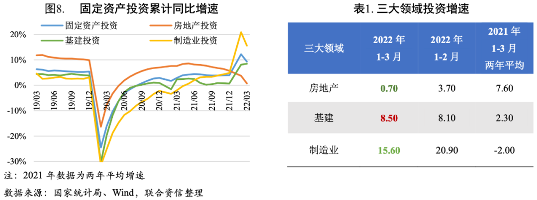 固定投資總體平穩(wěn),基建投資發(fā)力明顯,制造業(yè)投資邊際回落,房地產(chǎn)投資繼續(xù)惡化。2022年一季度全國固定資產(chǎn)投資(不含農(nóng)戶)10.49萬億元,同比增長9.30%,雖然較1-2月有所回落,但仍然在相對高位。三大領(lǐng)域投資方面,房地產(chǎn)開發(fā)投資繼續(xù)惡化,一季度房地產(chǎn)銷售面積與銷售額同比下降超過10%,銷售端惡化抑制地產(chǎn)投資,房企對于拿地、新開工較為謹慎;基建投資繼續(xù)發(fā)力,重大工程項目集中落地開工,體現(xiàn)了財政提前發(fā)力、穩(wěn)增長政策拉動投資的作用;制造業(yè)投資仍處高位,但3月邊際回落,政策利好、出口和工業(yè)生產(chǎn)的強勢仍是支撐因素。未來,隨著專項債券資金撥付使用進度加快、條件成熟的重大項目繼續(xù)推動,基建投資有望持續(xù)發(fā)力,擴大投資對經(jīng)濟的拉動作用。