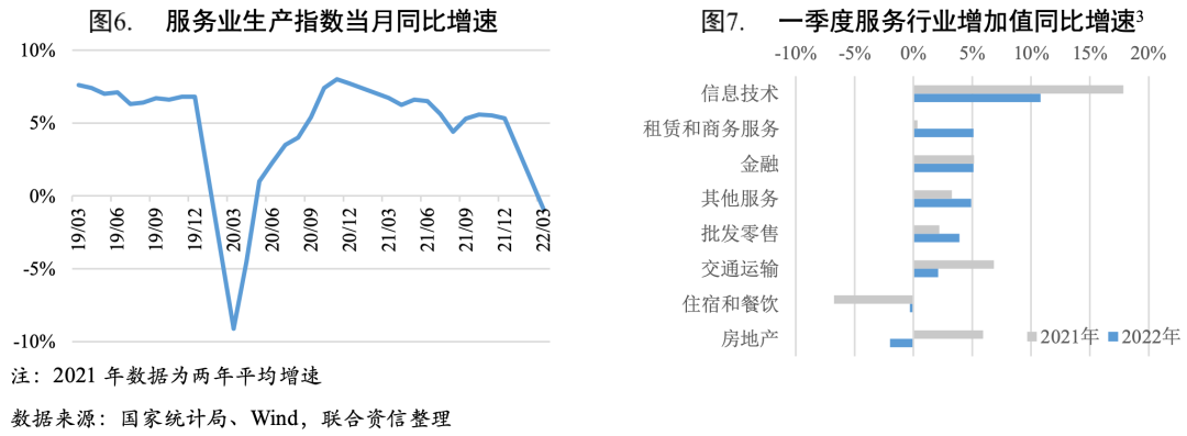 本輪疫情對服務(wù)業(yè)生產(chǎn)造成較大沖擊。受大規(guī)模疫情影響,3月服務(wù)業(yè)生產(chǎn)指數(shù)同比下降0.90%,接觸型服務(wù)領(lǐng)域受到較大沖擊。從行業(yè)來看,一季度信息傳輸、軟件和信息技術(shù)服務(wù)業(yè),租賃和商務(wù)服務(wù)業(yè)以及金融業(yè)發(fā)展較好,增加值同比增長超過5%;而房地產(chǎn)、住宿和餐飲行業(yè)增加值同比有所下降,受疫情影響較大。值得關(guān)注的是,3月以來受疫情影響,物流運輸不暢,客運低位運行,交通運輸行業(yè)受到較大沖擊。從數(shù)據(jù)來看,3月交通運輸、倉儲和郵政業(yè)生產(chǎn)指數(shù)同比下降8.10%,影響服務(wù)業(yè)生產(chǎn)指數(shù)下降0.80個百分點;營業(yè)性貨運量同比下降1.90%,客運量同比下降43.50%。