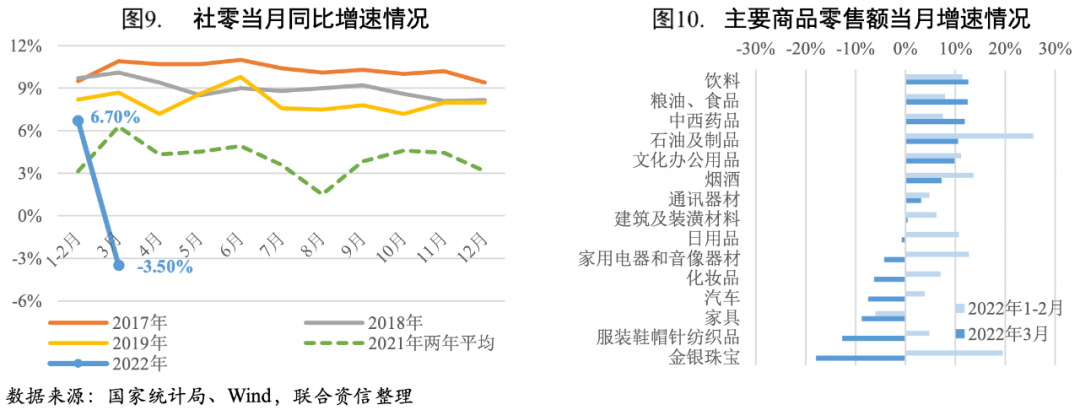 本輪疫情對消費市場沖擊較大,房地產(chǎn)鏈條商品銷售低迷。2022年一季度社會消費品零售總額10.87萬億元,同比增長3.30%,1-2月在春節(jié)和冬奧的帶動下消費修復(fù)有所加快,但3月本輪大規(guī)模疫情波及全國30個省市,居民出行消費明顯減少,當(dāng)月社零同比增速大幅回落至負值區(qū)間,其中餐飲收入同比大幅下降16.40%,限額以上商品方面,飲料、糧油食品、藥品等基本生活類商品消費韌性顯現(xiàn);油價上漲支撐石油及制品銷售額實現(xiàn)較快增長;金銀珠寶、服裝鞋帽等消費升級類商品3月零售額同比下降超過10%;受商品房銷售額大幅下降拖累,家具、建筑及裝潢材料等房地產(chǎn)鏈條商品銷售低迷;3月汽車銷售增長再次轉(zhuǎn)負,主要受到汽車產(chǎn)能承壓、部分汽車價格上調(diào)、產(chǎn)品交付周期延長以及消費動能不足等因素影響。