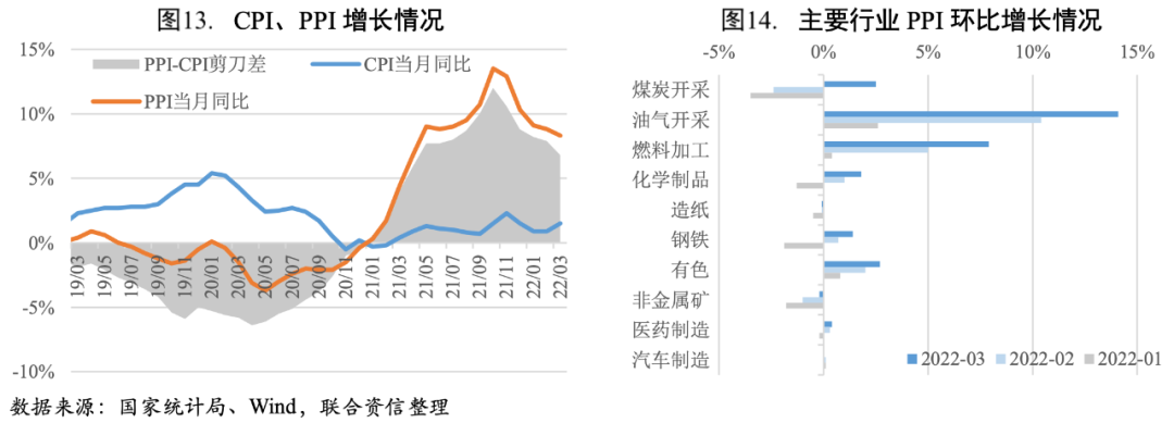 一季度CPI同比漲幅總體平穩(wěn),PPI同比漲幅逐月回落。CPI方面,受國內(nèi)多點散發(fā)疫情和國際能源價格波動等共同影響,2022年一季度CPI同比增長1.10%,豬肉等食品價格下跌對沖了部分能源價格上漲推動的上行空間。PPI方面,受原油、有色金屬等國際大宗商品價格上漲等因素影響,一季度PPI同比增長8.70%,各月PPI同比增速回落幅度有所減緩,環(huán)比增速由降轉(zhuǎn)漲,上行動力增強,輸入型通脹壓力抬升。地緣政治沖突等因素導(dǎo)致國際能源和有色金屬價格劇烈波動,帶動國內(nèi)油氣開采、燃料加工、有色金屬等相關(guān)行業(yè)價格上行。