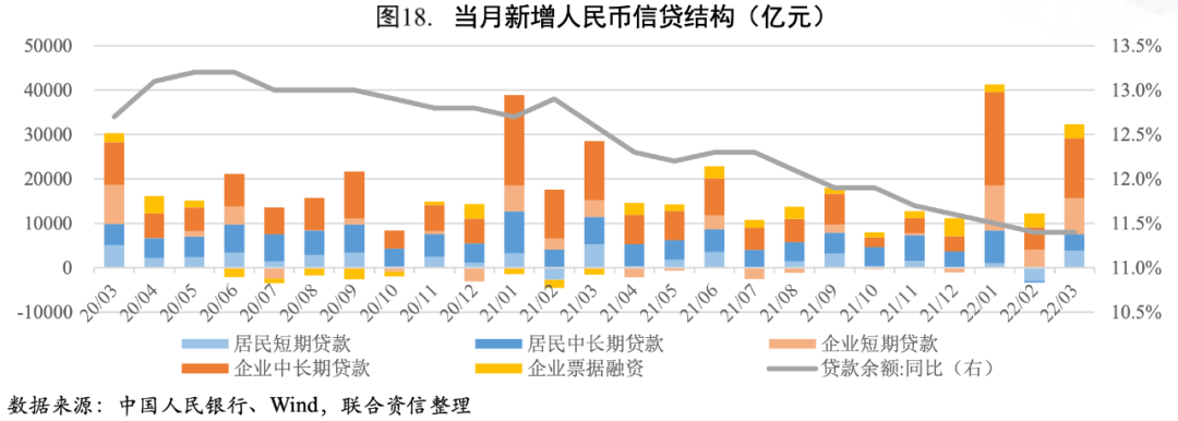 信貸總量回升但結(jié)構(gòu)欠佳,反映出實體經(jīng)濟融資需求依然較弱。2022年一季度金融機構(gòu)新增人民幣貸款8.34萬億元,比上年同期多增6636億元;3月末金融機構(gòu)人民幣貸款余額201.01萬億元,同比增長11.4%,增速與上月末持平,出現(xiàn)企穩(wěn)現(xiàn)象。從結(jié)構(gòu)看,居民端貸款同比大幅少增,顯示居民消費意愿和購房意愿偏弱,一季度居民短期貸款少增3886億元,中長期貸款少增9100億元;企業(yè)端貸款結(jié)構(gòu)進一步短期化,表明企業(yè)融資需求依然較低,一季度企業(yè)短期貸款同比多增1.03萬億元,票據(jù)融資同比多增1.28萬億元,但中長期貸款同比少增5200億元,說明短期貸款和票據(jù)融資沖量是企業(yè)貸款同比大幅多增的主要支撐因素。展望后市,隨著國內(nèi)疫情防控形勢逐步好轉(zhuǎn)、房地產(chǎn)調(diào)控政策進一步放松及結(jié)構(gòu)性貨幣政策持續(xù)發(fā)力,信貸結(jié)構(gòu)有望逐步改善。