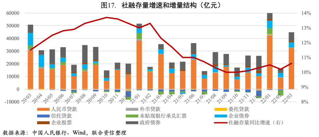 社融總量擴張,財政前置節(jié)奏明顯。2022年一季度新增社融規(guī)模12.06萬億元,比上年同期多增1.77萬億元;3月末社融規(guī)模存量同比增長10.6%,增速較上月末高0.4個百分點。從結(jié)構(gòu)看,財政前置帶動政府債券凈融資大幅增長,是支撐社融擴張的主要動力,一季度政府債券凈融資規(guī)模較上年同期多增9238億元。由于從發(fā)債到形成實物量之間存在一定時滯,因此當(dāng)前的高規(guī)模發(fā)債或?qū)Χ径鹊幕ㄍ顿Y形成有利的資金支持。其他支撐因素包括對實體經(jīng)濟發(fā)放的人民幣貸款、企業(yè)債券凈融資、信托貸款,一季度較上年同期分別多增4258億元、多增4050億元、少減1879億元。展望后市,在穩(wěn)增長訴求下積極的財政政策和穩(wěn)健的貨幣政策將適時加力,推動社融總量繼續(xù)擴張。