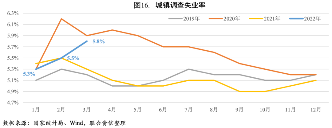 一季度我國城鎮(zhèn)調(diào)查失業(yè)率均值為5.50%,同比上升0.10個百分點。其中,1-2月就業(yè)情況總體穩(wěn)定,全國城鎮(zhèn)調(diào)查失業(yè)率接近上年同期水平,環(huán)比小幅上升主要是春節(jié)假期的影響,符合季節(jié)性變化規(guī)律;而3月以來國內(nèi)局部疫情加重,交通運輸、住宿餐飲、批發(fā)零售、文化旅游等服務(wù)行業(yè)受影響較大,用工需求減弱,城鎮(zhèn)調(diào)查失業(yè)率上升至5.80%,較上年同期上升0.50個百分點,穩(wěn)就業(yè)壓力有所增大。