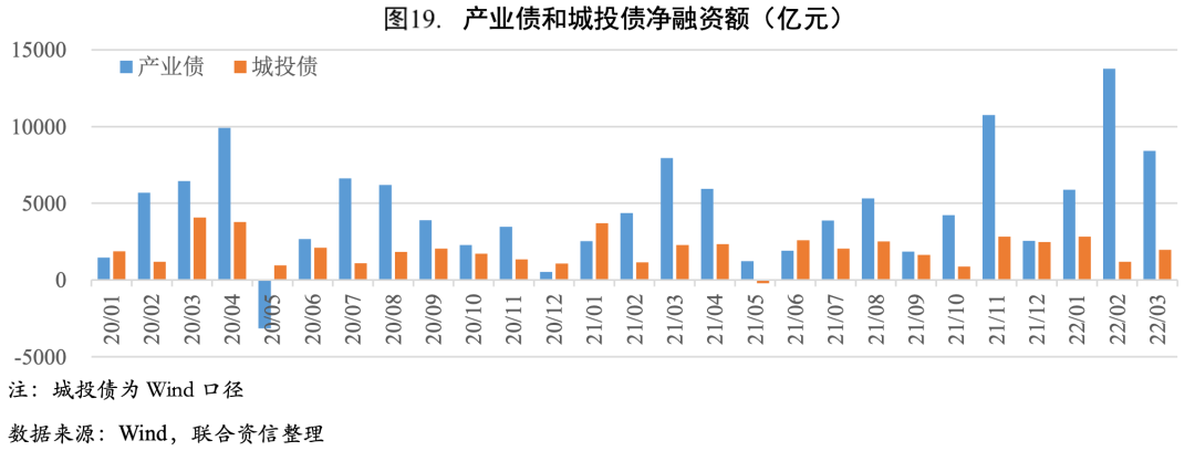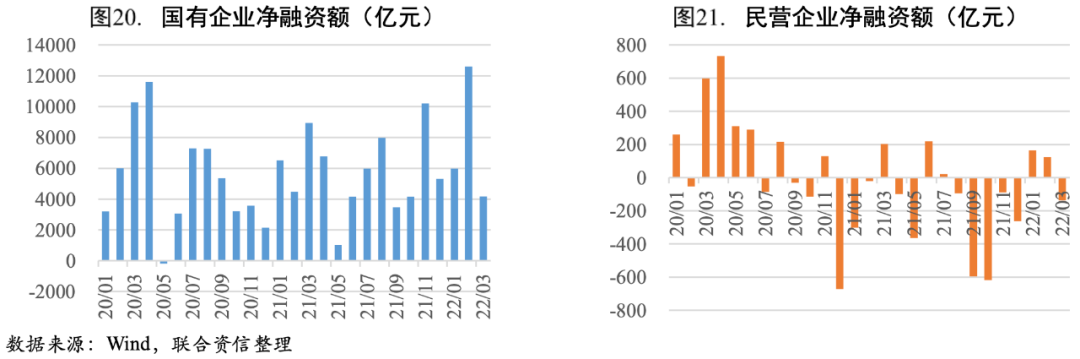 非金融企業(yè)債券凈融資規(guī)模擴張,結(jié)構(gòu)分化較為顯著。一季度在穩(wěn)增長政策發(fā)力下,企業(yè)部門信用債凈融資1.31萬億元,較上年同期多增4051億元,企業(yè)債券凈融資規(guī)模繼續(xù)擴張,但結(jié)構(gòu)分化較為顯著。從行業(yè)結(jié)構(gòu)看,產(chǎn)業(yè)債市場信用明顯擴張,城投債信用擴張有所放緩。從企業(yè)性質(zhì)看,國企債和民企債市場信用均有所擴張,但值得關(guān)注的是,3月民企債市場信用由擴張轉(zhuǎn)為收縮;從區(qū)域結(jié)構(gòu)看,區(qū)域信用延續(xù)分化態(tài)勢,其中3月內(nèi)蒙古、廣東、甘肅等省市信用收縮較為明顯(詳見《信用總量大幅擴張,結(jié)構(gòu)分化依然顯著——從2022年3月社融數(shù)據(jù)看我國宏觀信用狀況》)。