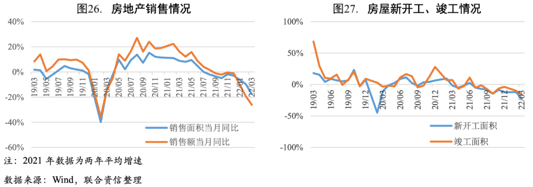 2022年一季度房地產(chǎn)銷售持續(xù)下探。2022年以來,多地適度放開限購限售,降低公積金使用門檻、調(diào)降房貸利率、加快房貸審批節(jié)奏,但在政策放松的同時,一季度房地產(chǎn)銷售面積與銷售額同比下降超過10%,3月銷售額同比下降至26.16%。房地產(chǎn)銷售端惡化抑制房地產(chǎn)投資,房企對于拿地、新開工也較為謹慎。