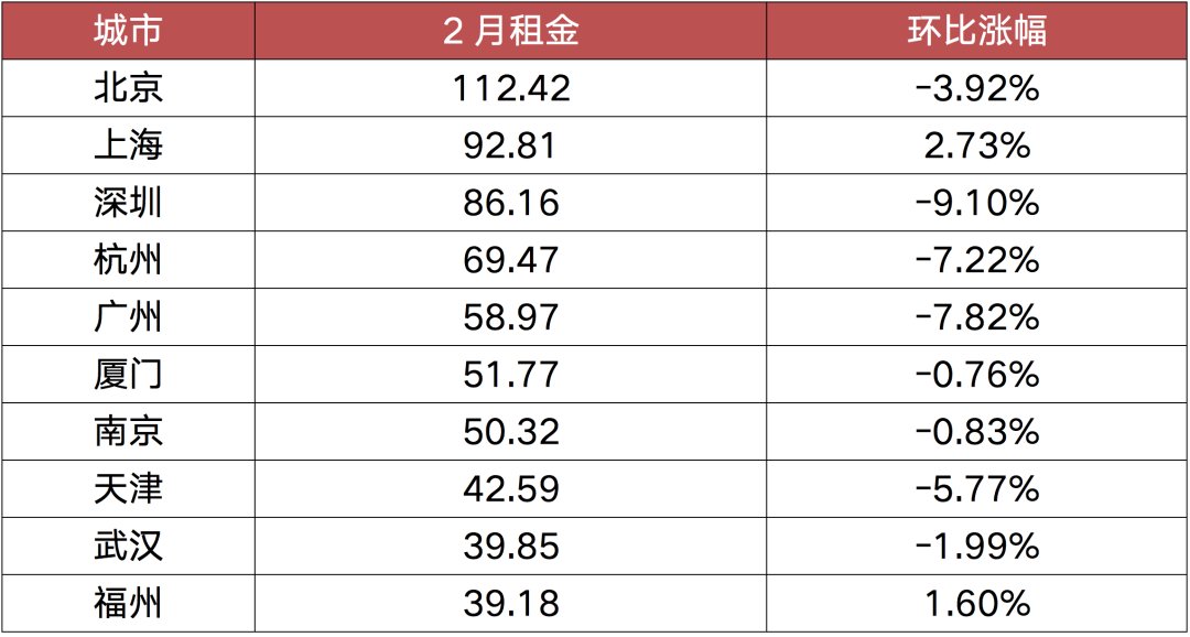 當前市場租金價格仍處于高位,2月單月租金仍接近去年全年平均值,有14個城市租金水平高于平均租金。