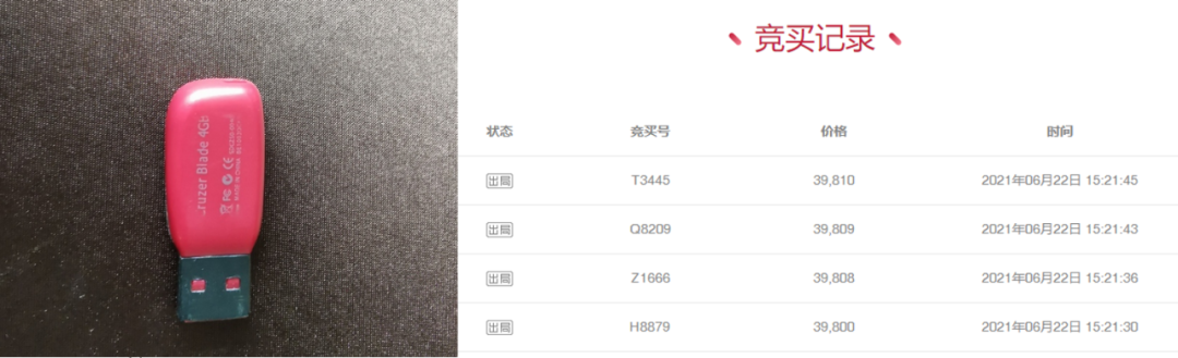 但6月21日結(jié)束時(shí),該U盤的競(jìng)買價(jià)格已升至1512元。而截至6月22日15時(shí)21分45秒,即拍賣中止前,該U盤的拍賣價(jià)格更是高達(dá)39810元,共有1186次競(jìng)買,總計(jì)吸引了超29萬(wàn)次圍觀。