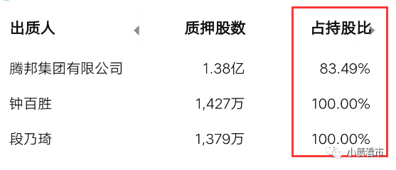 截至最新報告期,騰邦集團已質押1.38億股騰邦國際股份,占其所持股份比例為83.49%;而公司實控人鐘百勝股權質押率為100%。