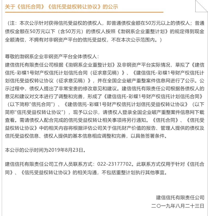 參與信托計劃的債權人或其繼受人依法享有對非鋼資產平臺、信托計劃、受益人大會等知情權。在信托計劃成立之后,債權人或受益人認為有必要對信托計劃調整的,可依據公司法、信托法、信托計劃等規(guī)定依法進行調整。
