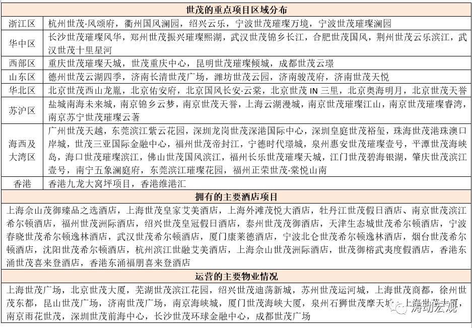 截至2021年6月底,世茂系共擁有424個項目、7283萬平方米(權益前)的土地儲備,不過其重點項目主要分布在浙江、華中、蘇滬、西部、山東、華北、海西及大灣區、香港等八個區域。同時擁有20個主要酒店(2021年上半年貢獻收入達到9.72億元)和20個商業物業(2021年上半年租金收入為6.29億元)。