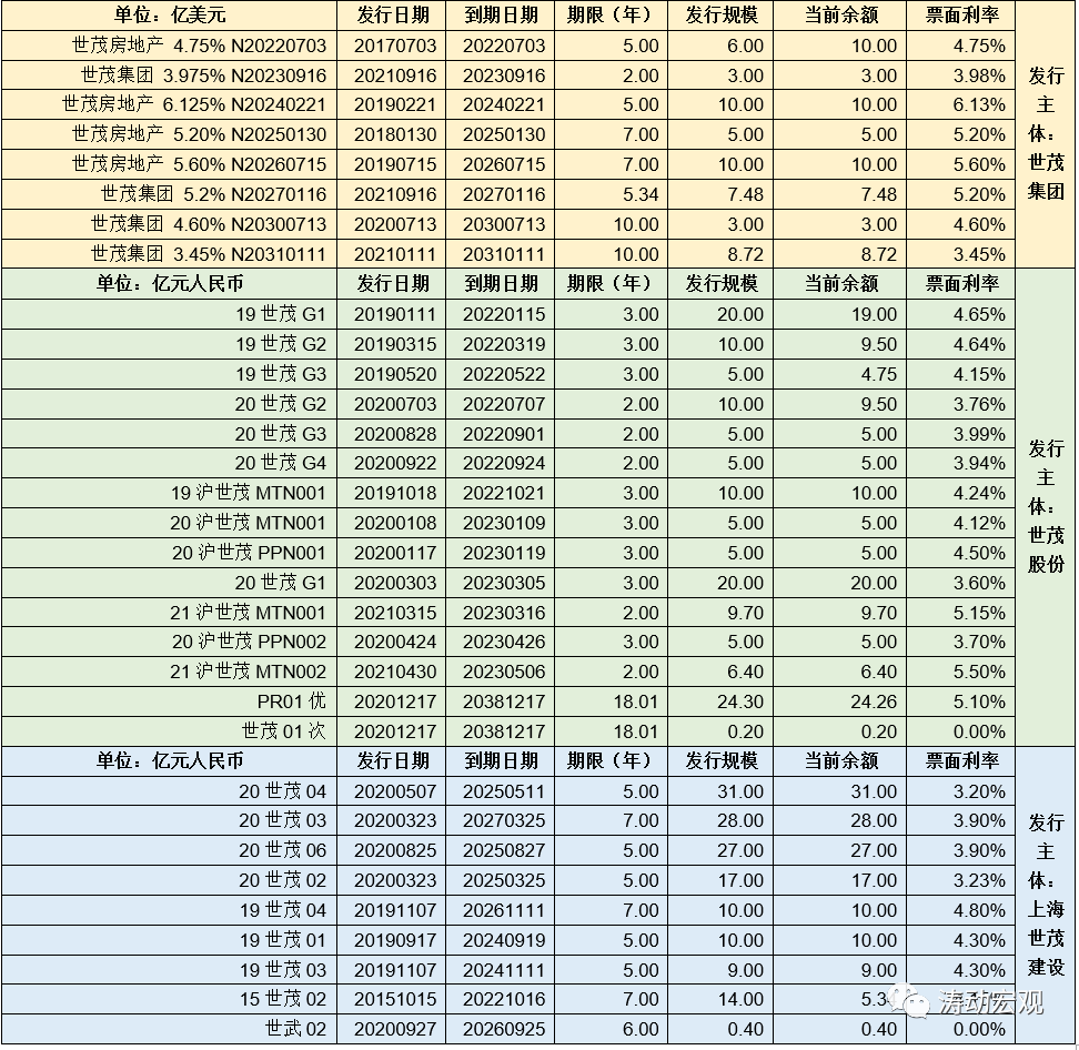1、截至2021年底,世茂集團共有存續境外美元債8只(余額合計達到64.20億美元)、世茂股份共有存續信用債15只(余額合計達到113.85億元)、上海世茂建設共有存續信用債9只(余額合計達到137.34億元)。