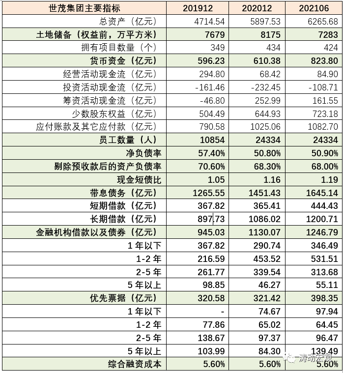 截至2021年6月,世茂集團總資產達到6266億元,連續多年處于上漲態勢中。同時世茂集團的貨幣資金(含受限)余額達到824億元,不過真正非受限的貨幣資金(按25%的比例計算)可能只有200億元,若按照2021年下半年預售資金監管趨嚴的態勢來看,則世茂系真正可動用的資金會更少。