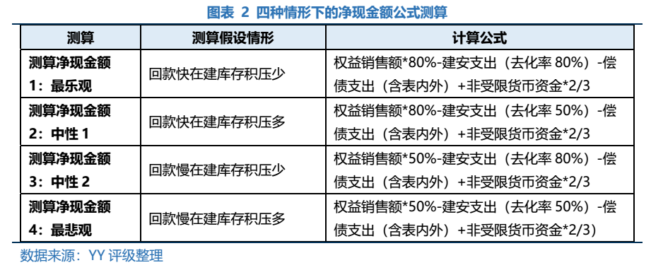 我們的假設(shè)最核心的是假設(shè)企業(yè)不再拿地和到期債務(wù)清償為主(含可動用貨幣資金),在此基礎(chǔ)上大致基于以下次生假設(shè):分2個維度,各區(qū)分2種情形:周轉(zhuǎn)去化率樂觀及悲觀分別為80%、50%;銷售回款率樂觀時80%,悲觀時僅為50%,總計從樂觀到悲觀延伸4種組合。